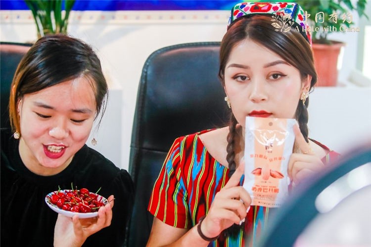 Livestreamers advertise local agricultural products during a livestreaming session in northwest China’s Xinjiang Uygur Autonomous Region. (Photo courtesy of “A Date With China” media tour)