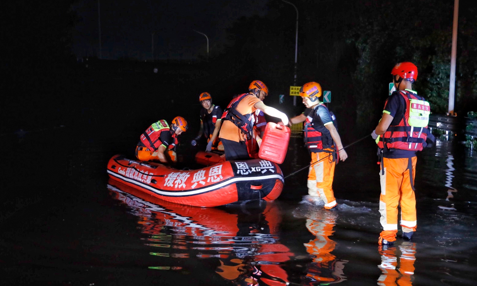 Rescue workers put relief goods into one raft boat. Photo: Li Hao/GT