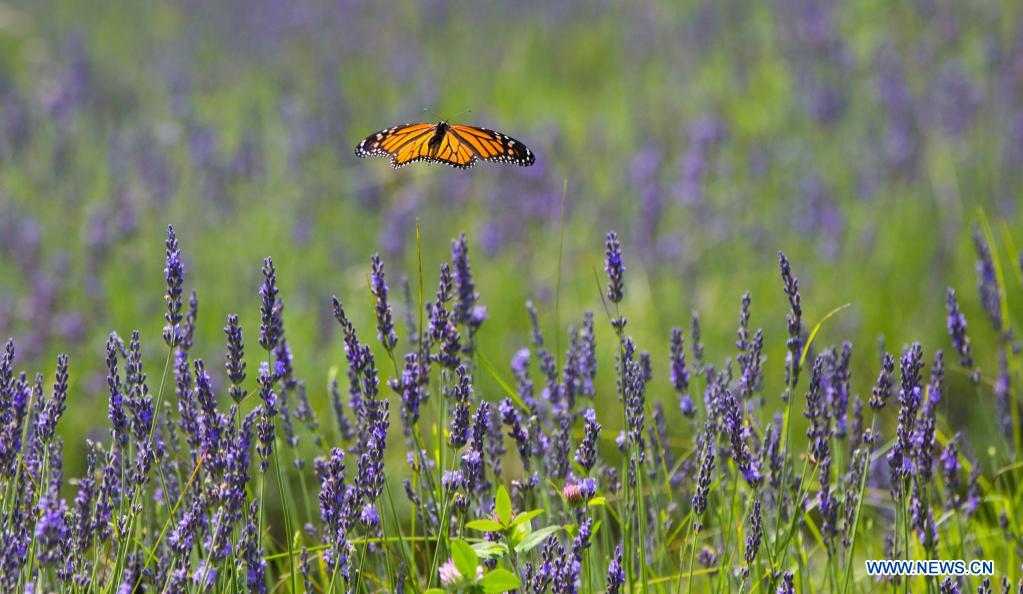 A butterfly flies over lavenders at Terre Bleu Lavender Farm in Milton, Ontario, Canada, on July 23, 2021. (Photo by Zou Zheng/Xinhua)