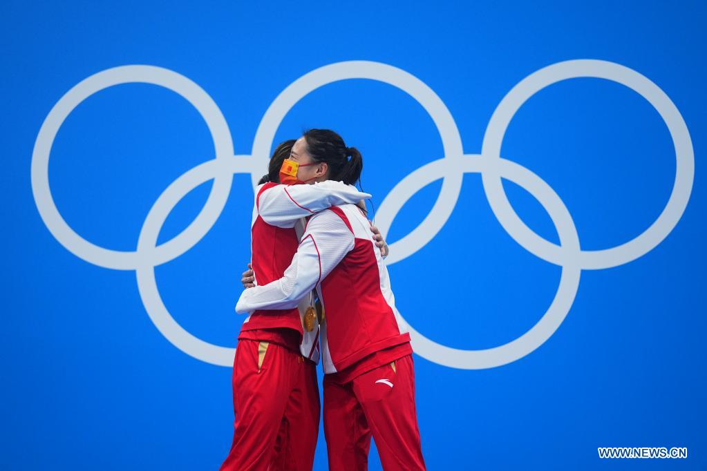 Medalists Shi Tingmao (L) and Wang Han of China hug each other on the awarding ceremony of the women's synchronised 3m springboard of diving at Tokyo 2020 Olympic Games in Tokyo, Japan, July 25, 2021. (Xinhua/Xu Chang)