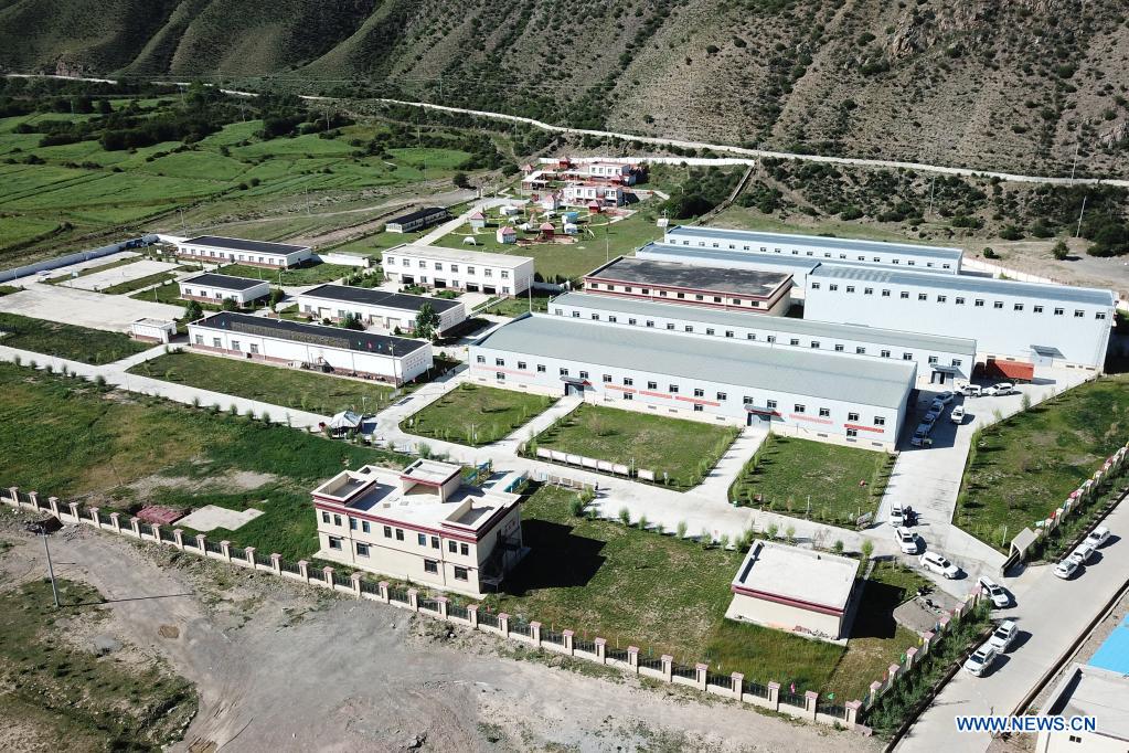 Aerial photo taken on July 24, 2021 shows a view of the production park of a highland barley processing company in Lhorong County, Chamdo Prefecture, southwest China's Tibet Autonomous Region. Lhorong County abounds with highland barley. Traditionally, harvested highland barley were directly made into zanba (a traditional rice cake). With the updated production technique, various highland barley products have been produced after further processing such as zanba biscuit, zanba pastry and barley noodles, which boosted the added-value of agricultural products and also promoted sales. (Xinhua/Li Xin)