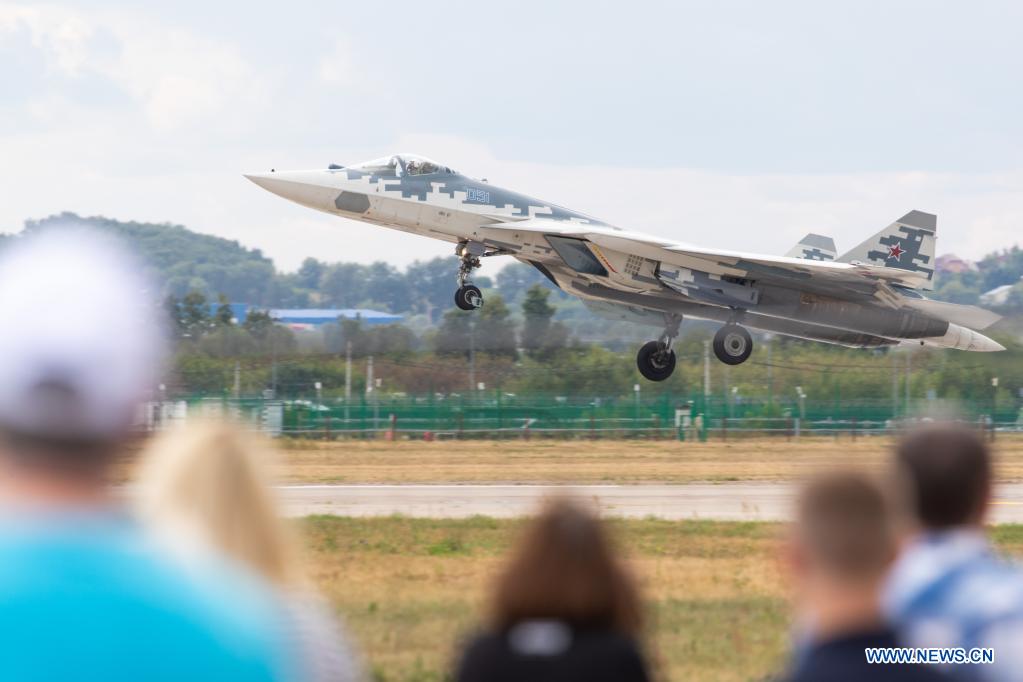 A Sukhoi Su-57 fighter jet is seen during the closing day of the International Aviation and Space Salon (MAKS)-2021 in a Moscow suburb, Russia, on July 25, 2021. (Xinhua/Bai Xueqi)