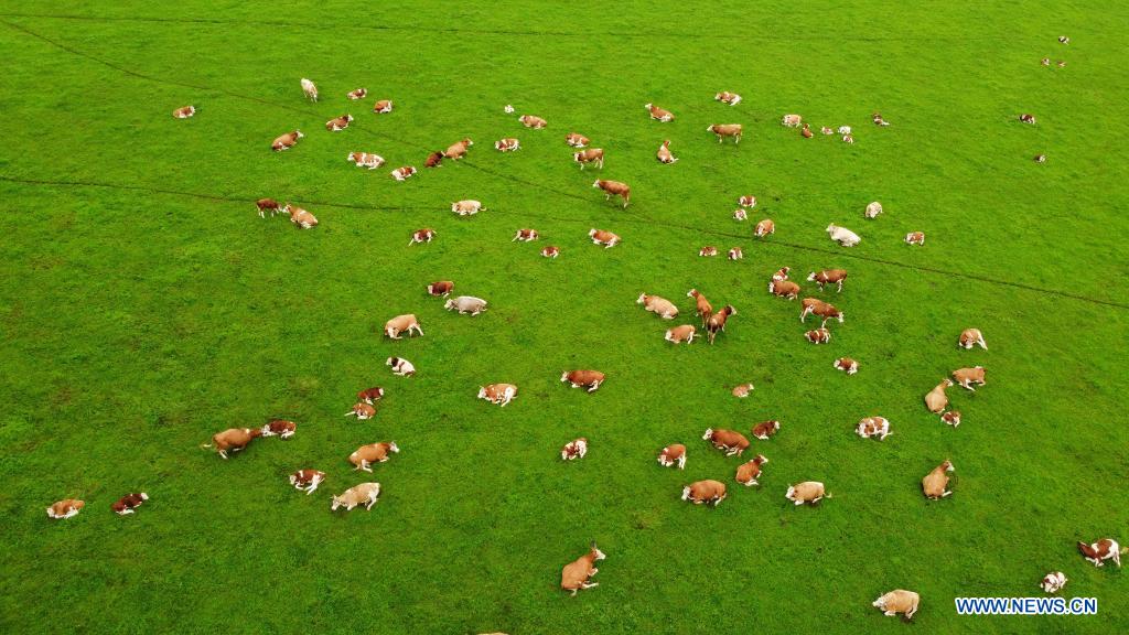 Aerial photo taken on July 26, 2021 shows a herd of cattle on the Wulanmaodu pasture, which is located in the northern part of Horqin Right Wing Front Banner, Hinggan League, north China's Inner Mongolia Autonomous Region. (Xinhua/Bei He)