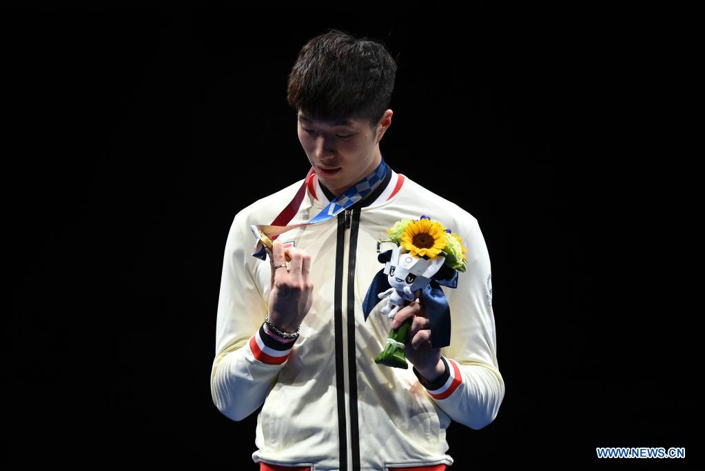 Cheung Ka Long of China's Hong Kong reacts during the ceremony for the men's foil individual gold madal bout at the Tokyo 2020 Olympic Games in Tokyo, Japan, on July 26, 2021. (Xinhua/Zhang Hongxiang)