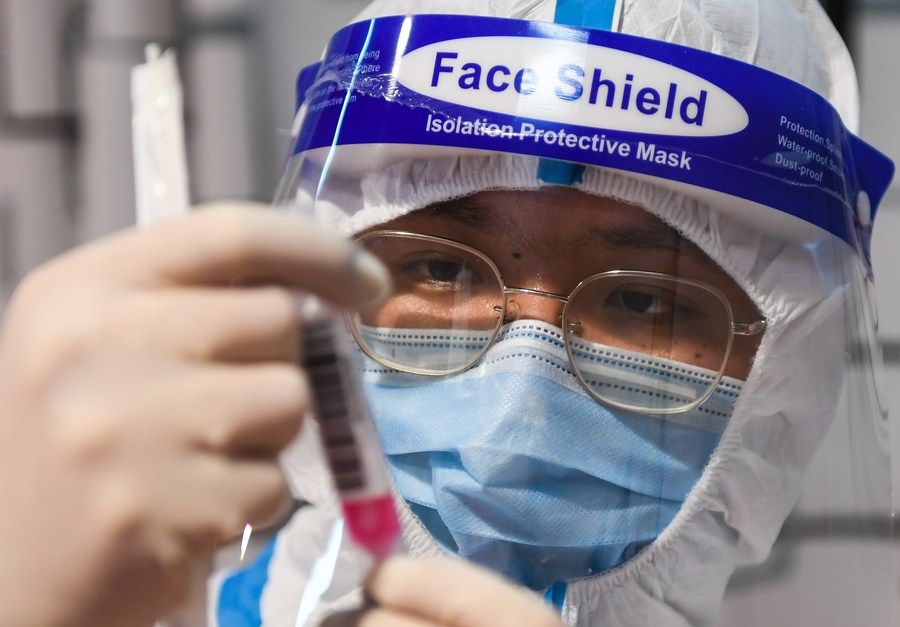 A doctor works at a COVID-19 testing site in Jiangning District of Nanjing, capital of east China's Jiangsu Province, July 25, 2021. (Xinhua/Ji Chunpeng)