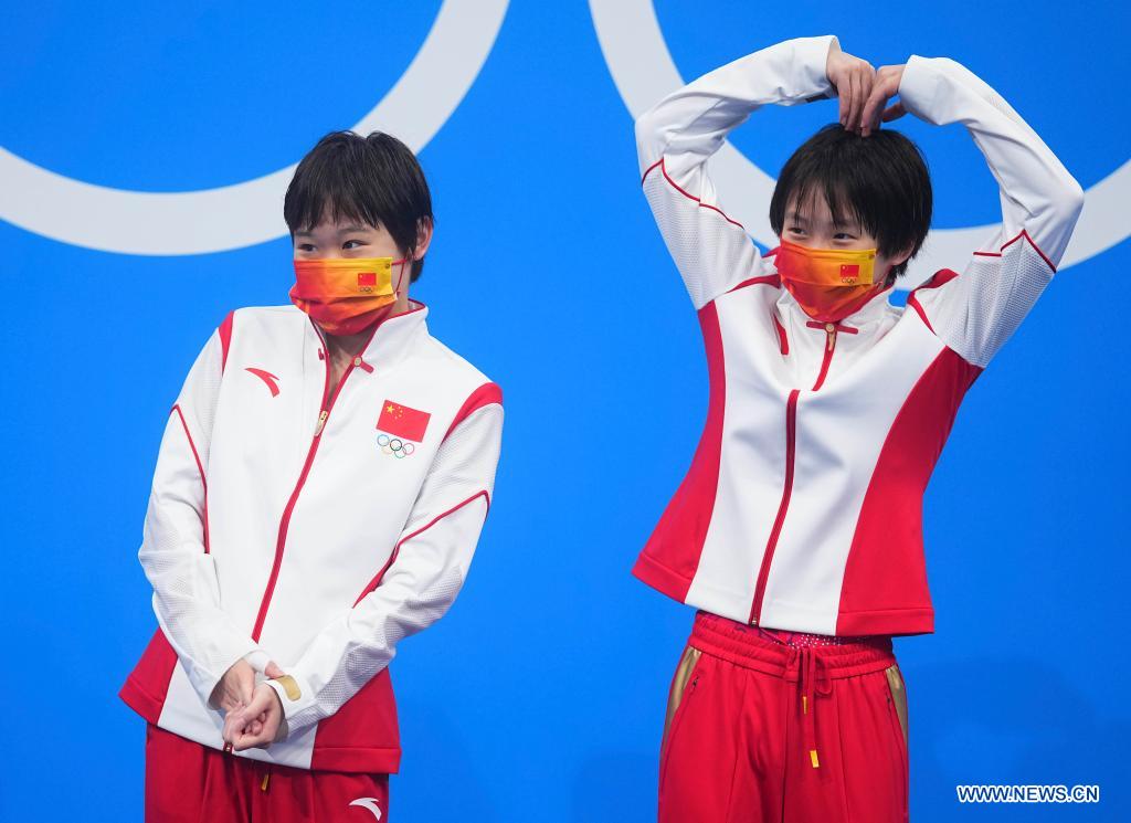 Chen Yuxi (R) and Zhang Jiaqi of China celebrate on the awarding ceremony of women's synchronised 10m platform of diving at Tokyo 2020 Olympic Games in Tokyo, Japan, July 27, 2021. (Xinhua/Xu Chang)