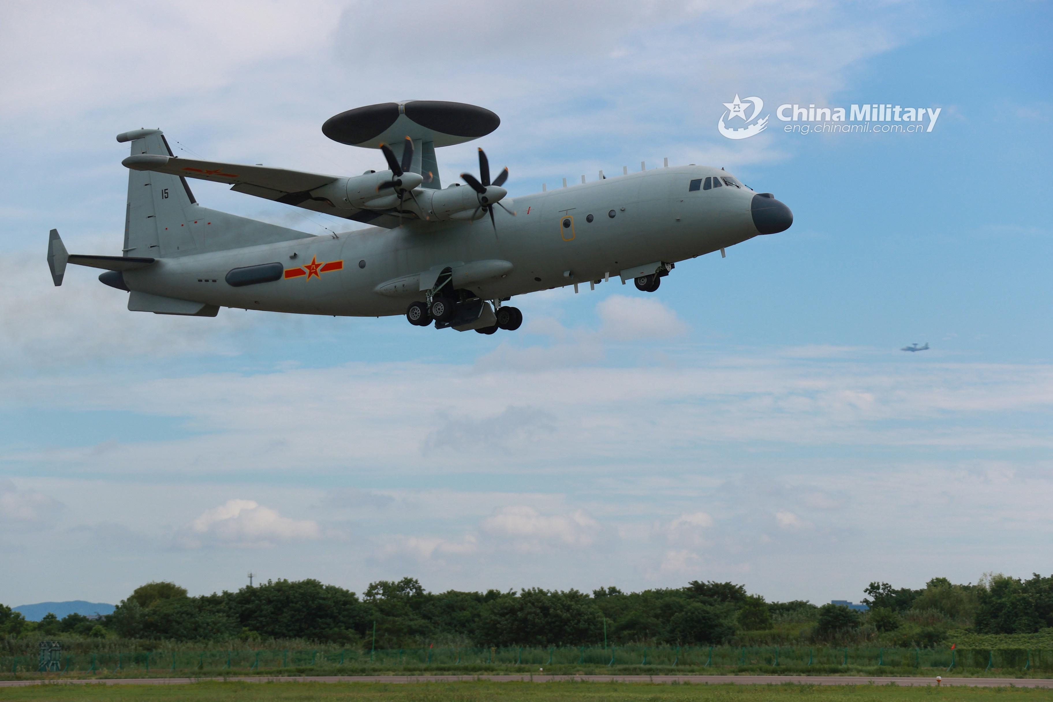 An airborne early warning (AEW) aircraft attached to a naval aviation division under the PLA Eastern Theater Command spins its propellers and takes off for a maritime flight training exercise on July 17, 2021. (eng.chinamil.com.cn/Photo by Yu Mingzhe)