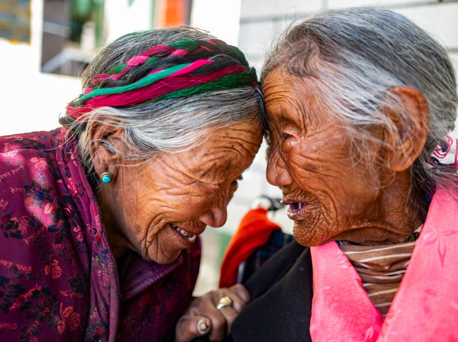 Sonam Drolma (R) interacts with her sister in Reguo Village of Gyaca County in Shannan, southwest China's Tibet Autonomous Region, March 24, 2020. (Xinhua/Purbu Zhaxi)