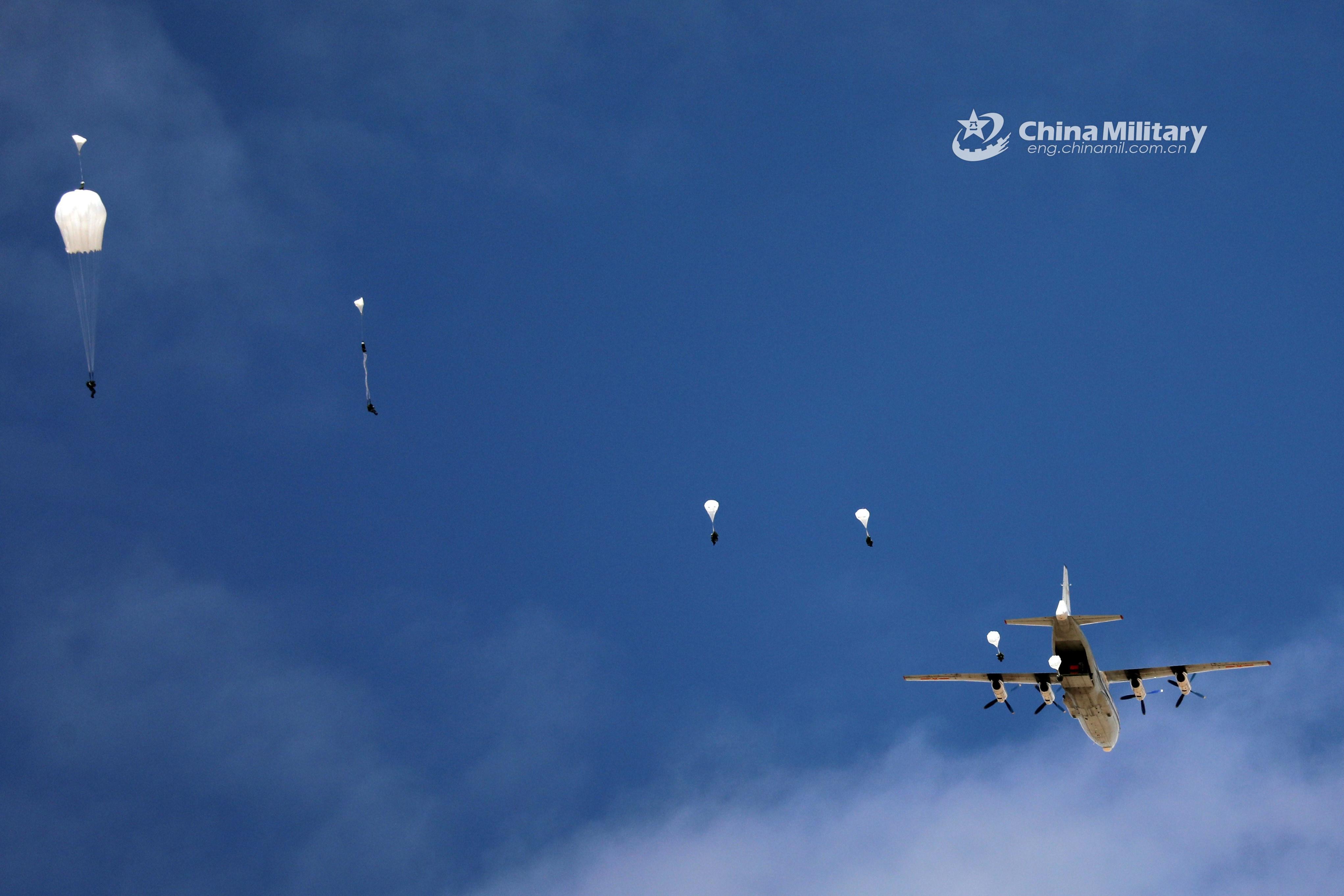 Paratroopers assigned to a brigade of the PLA Air Force’s airborne troops descend to the ground after jumping out of a transport aircraft during a parachuting exercise in northwestern China’s plateau area on July 15, 2021. The exercise aimed to train the troops’ rapid mobility, long-range penetration and other realist combat skills in high altitude areas. (eng.chinamil.com.cn/Photo by Ma Zian)