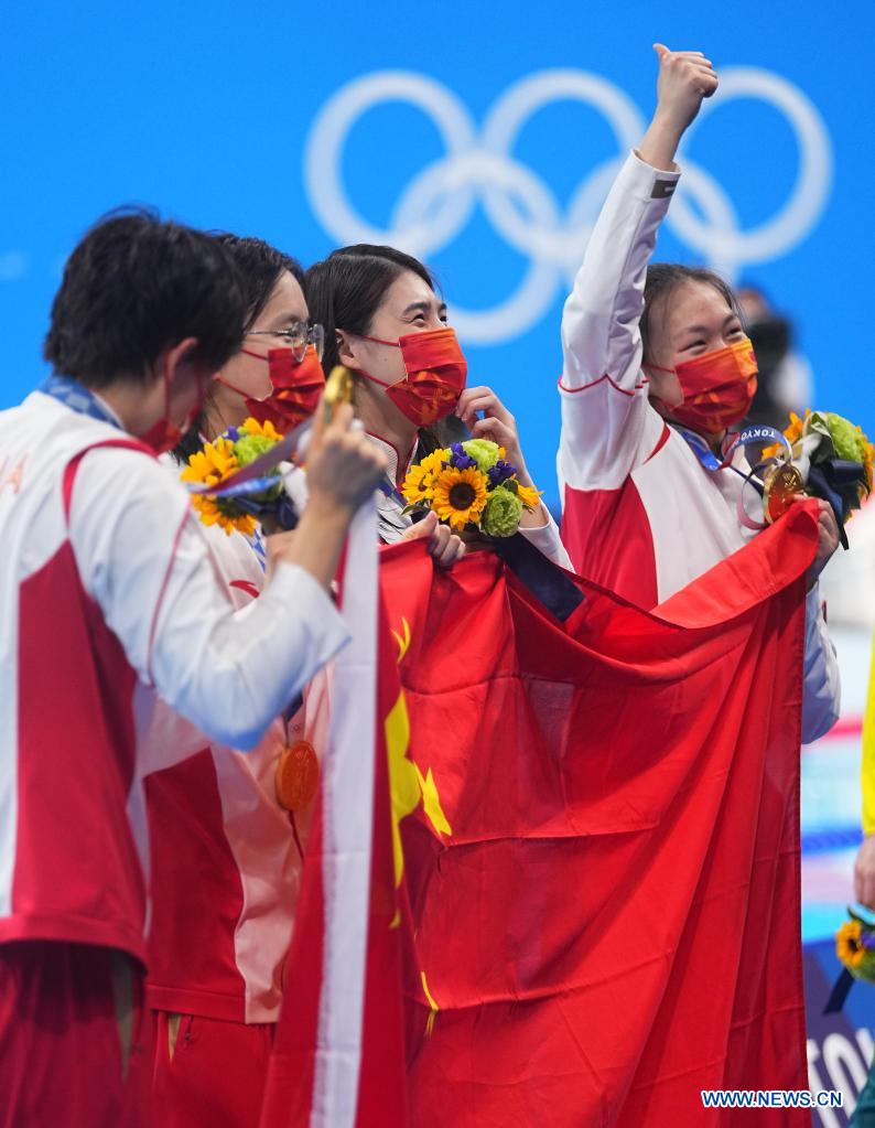Yang Junxuan, Tang Muhan, Zhang Yufei and Li Bingjie (from L to R) of China pose for photos after the awarding ceremony of the women's 4x200m freestyle relay final of swimming at the Tokyo 2020 Olympic Games in Tokyo, Japan, July 29, 2021. (Xinhua/Xu Chang)