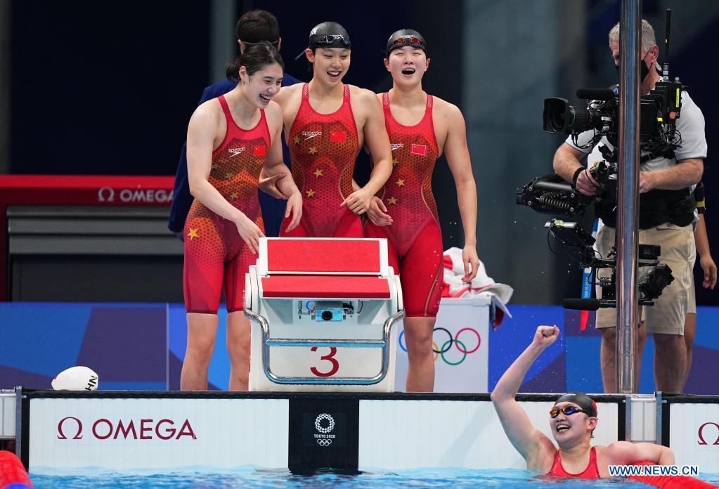 Members of team China celebrate after winning the women's 4x200m freestyle relay final of swimming at the Tokyo 2020 Olympic Games in Tokyo, Japan, July 29, 2021. (Xinhua/Xu Chang)
