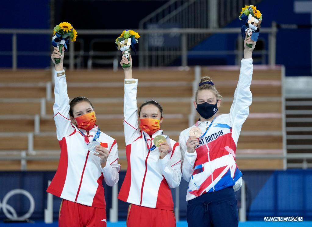 Zhu Xueying (C), Liu Yingying (L) of China and Bryony Page of Great Britain celebrate during the awarding ceremony for the women's final of trampoline gymnastics at the Tokyo 2020 Olympic Games in Tokyo, Japan, July 30, 2021. (Xinhua/Cheng Min)
