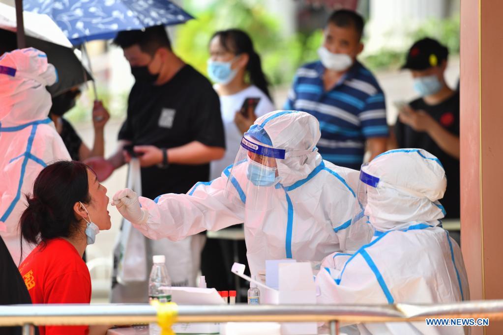 Health workers collect swab samples at a COVID-19 nucleic testing site in Nandaqiao community, Chiling Road sub-district, Tianxin District of Changsha, capital of central China's Hunan Province, July 31, 2021. Local COVID-19 prevention and control authority in Changsha announced Saturday that three areas in the city have heightened their risk for COVID-19 infection from low to medium, and all-inclusive nucleic testing is now under way in these areas. (Xinhua/Chen Zeguo)