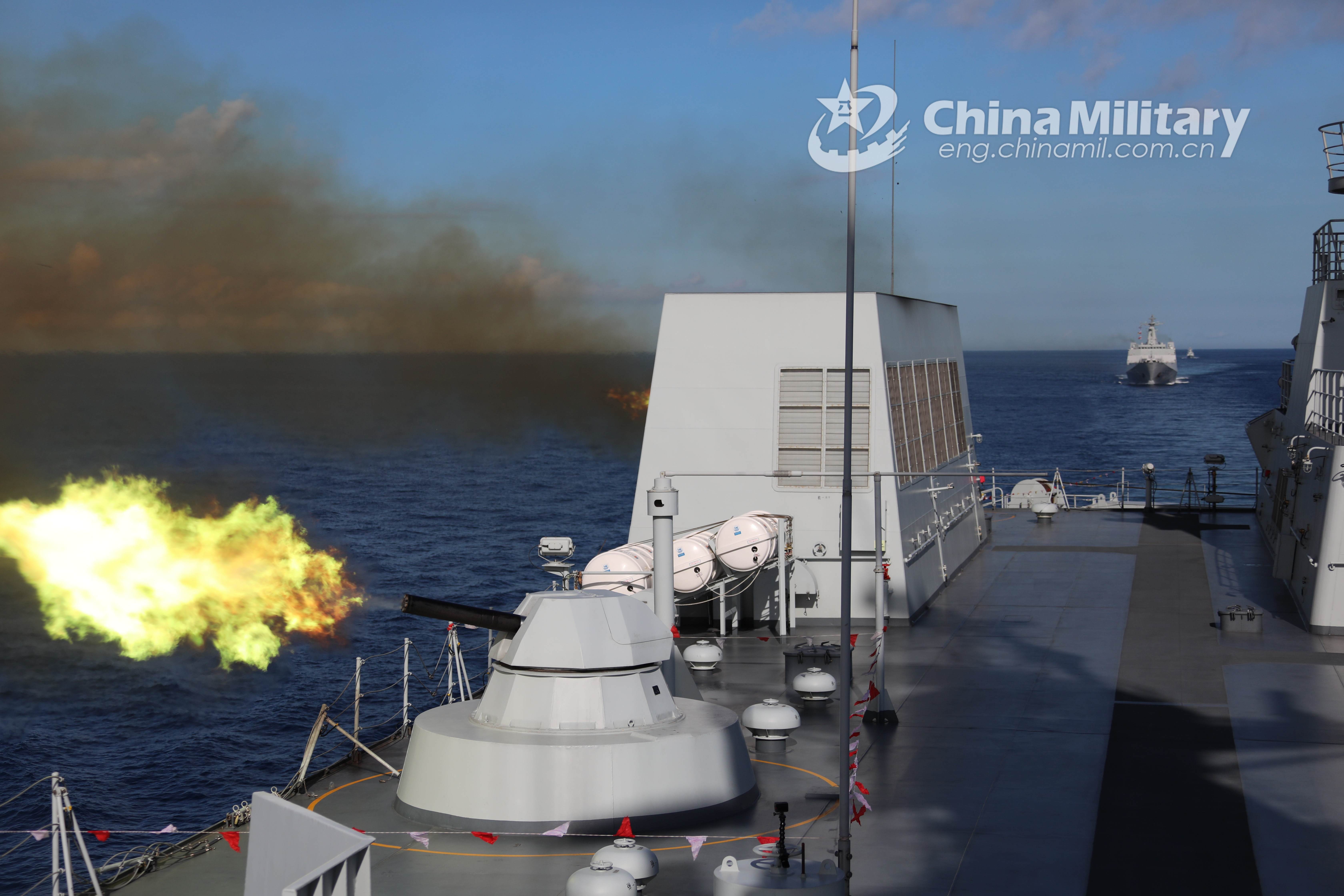 The amphibious dock landing ship Qilianshan (Hull 985) attached to a landing ship flotilla with the navy under the PLA Southern Theater Command fires its close-in weapons system at mock sea targets during a maritime realistic training exercise in waters of the South China Sea in mid July, 2021. (eng.chinamil.com.cn/Photo by Qiao Chenxi)