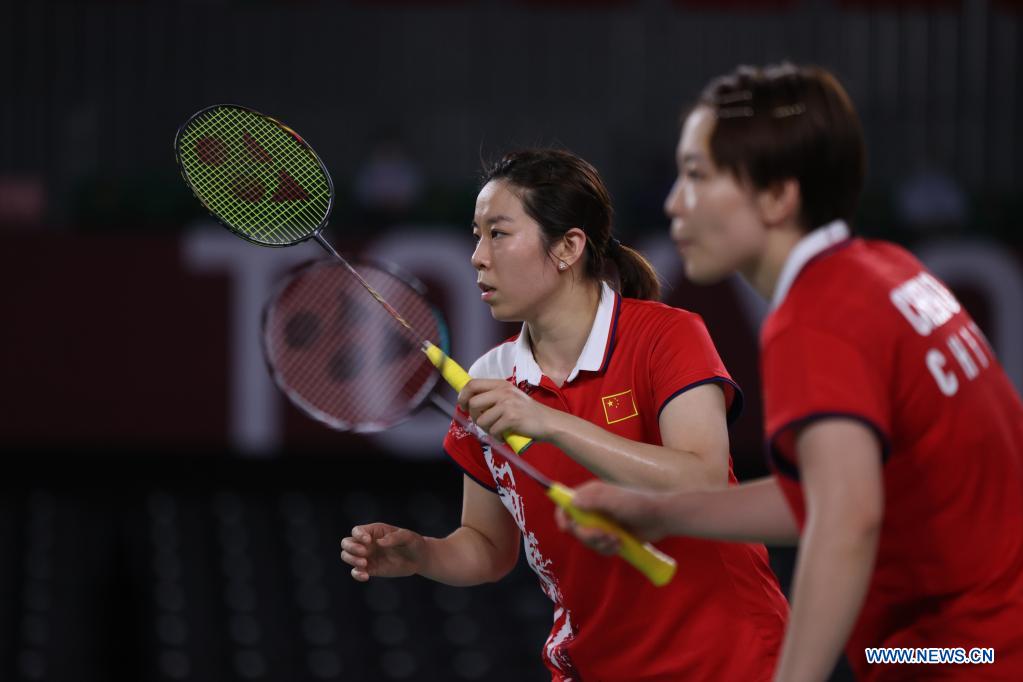 Chen Qingchen/Jia Yifan (L) of China react during the badminton women's doubles gold medal match between Chen Qingchen/Jia Yifan of China and Greysia Polii/Apriyani Rahayu of Indonesia at the Tokyo 2020 Olympic Games in Tokyo, Japan, Aug. 2, 2021. (Xinhua/Ou Dongqu)