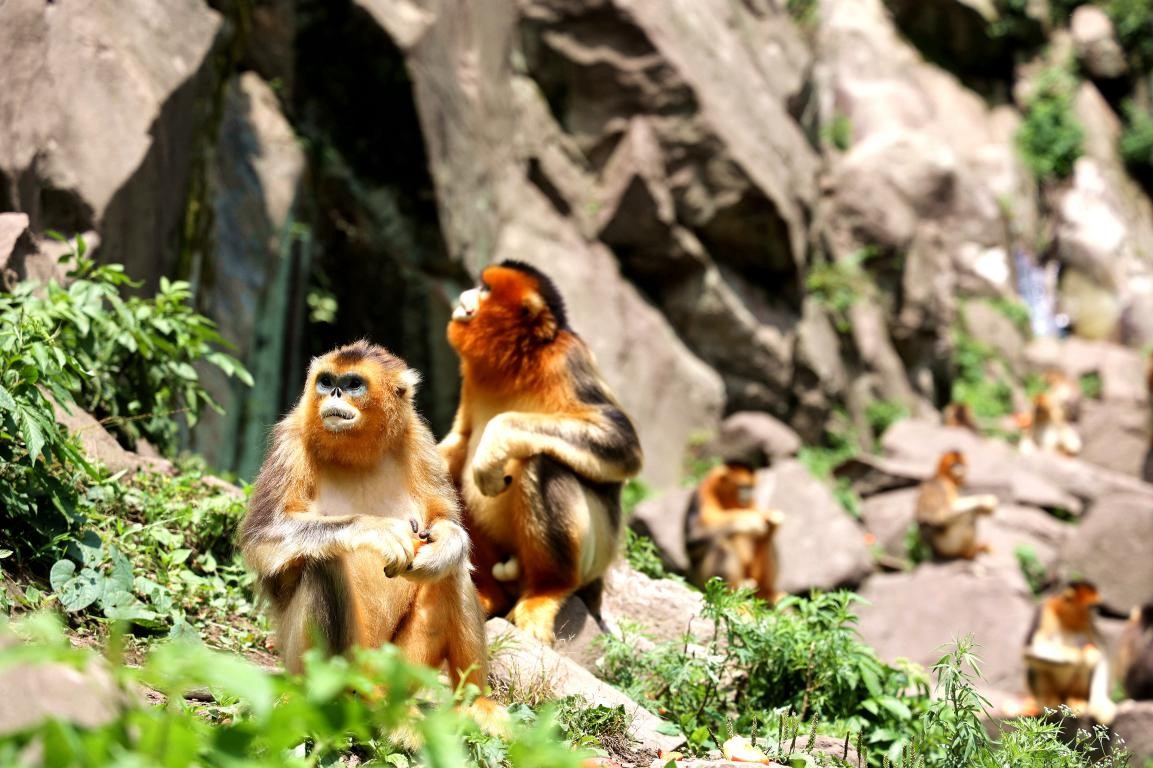Photo taken on July 17, 2021, shows golden snub-nosed monkeys at Yuhe National Natural Reserve in Wudu district, Longnan city, northwest China’s Gansu province. (Photo by Huang Peijun/People’s Daily Online)