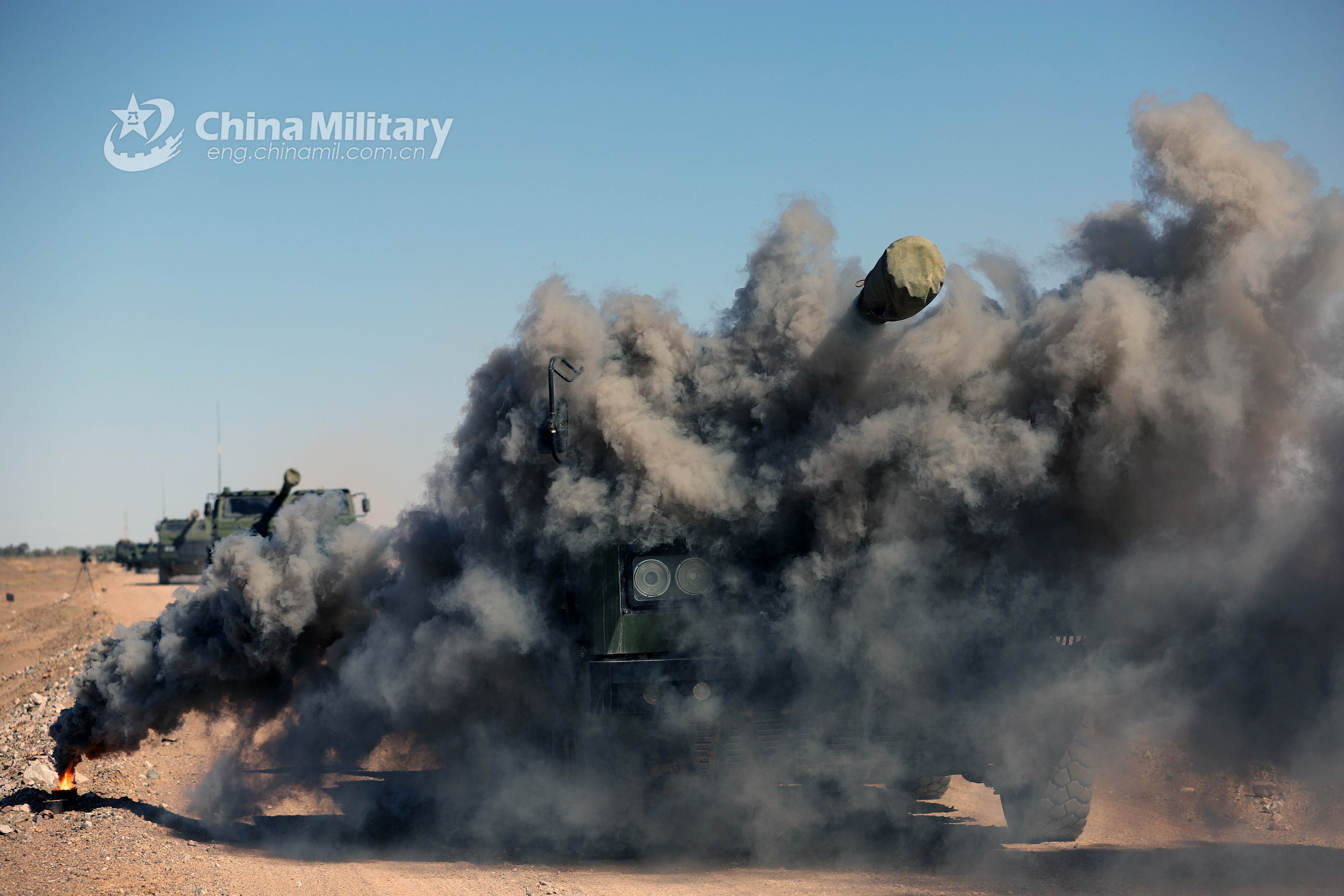 A convoy of armed military trucks rumbles in speed through the simulated infected zone on unfamiliar territory during the integrated training exercise organized by an artillery brigade under the PLA 72nd Group Army on July 17, 2021. The exercise aimed to assess the troops’ operational adaptability in realistic combat scenario. (eng.chinamil.com.cn/Photo by Huang Baochuan)