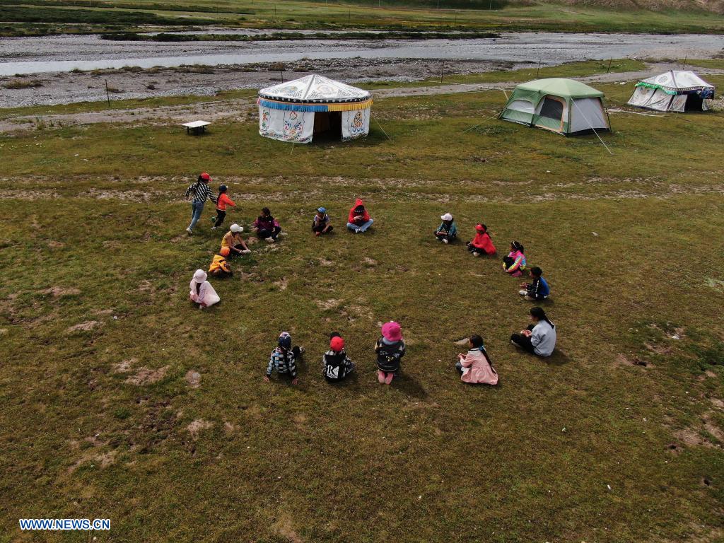 Children enjoy their summer vacation at a daycare center in Nyainca Village of Maqen County, Golog Tibetan Autonomous Prefecture, in northwest China's Qinghai Province, Aug. 2, 2021. Nyainca Village is located at the foot of the A'nyemaqen Mountain in northwest China's Qinghai Province. As the local herdsmen are busy moving to the summer pastures, their school-age children may find it difficult to participate in group activities during the summer vacation, and some are even left unattended. In 2018, the local authorities have launched a project to provide free daycare services for the kids during the summer vacation to ease the pressure on busy parents. Now the program has been promoted in all 35 administrative villages of Maqen County, and is well received by the locals. (Xinhua/Li Zhanyi)