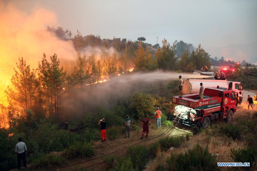 A forest is on fire near Manavgat, Antalya province, Turkey, on Aug. 3, 2021. For the last week, Turkey has been battling massive wildfires that erupted in the southern and southwestern coastal resort towns. The blazes have claimed eight lives so far. (Xinhua)