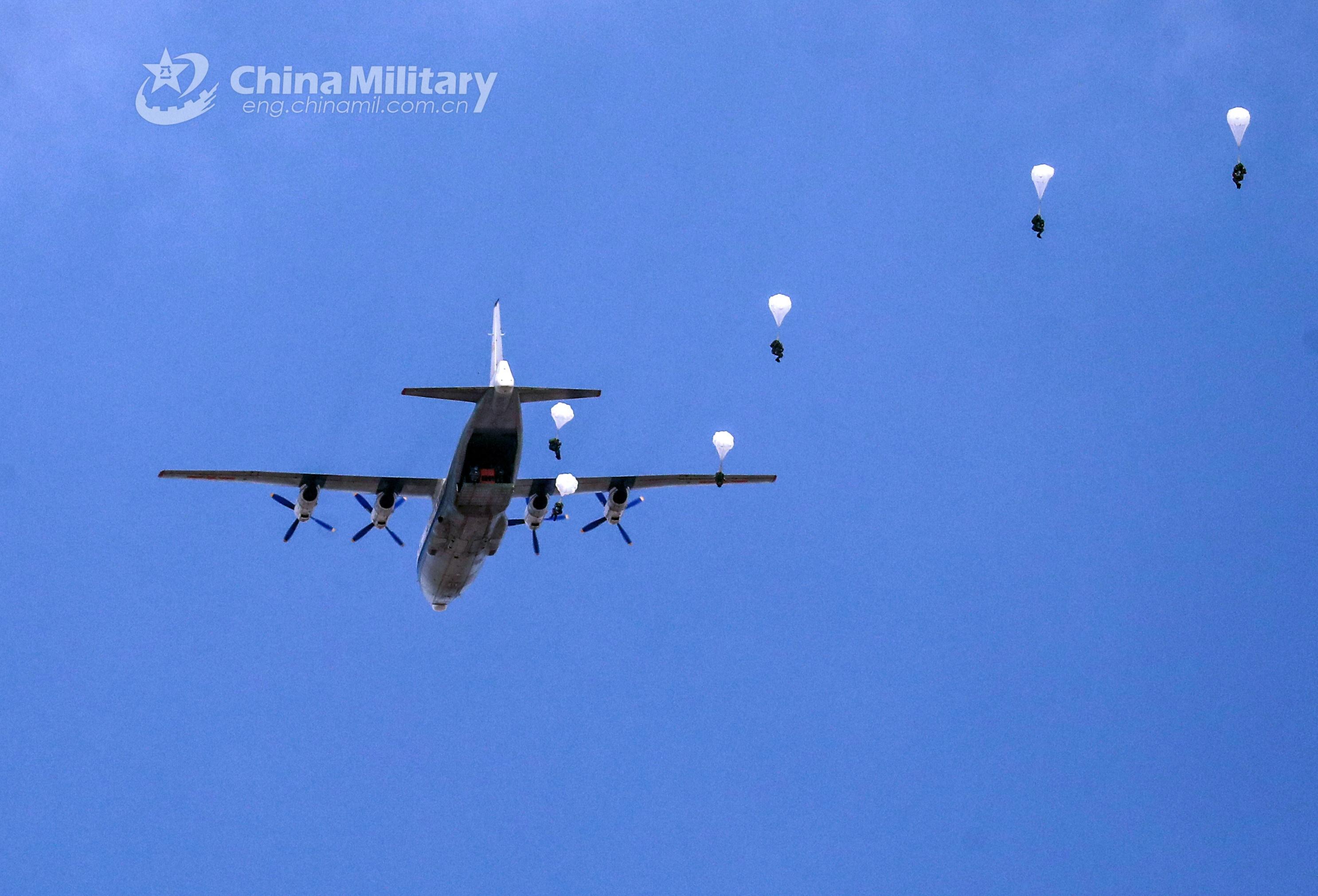 Paratroopers assigned to a brigade under the PLA Air Force’s airborne troops descend to the drop zone after jumping from a transport aircraft during a parachute training exercise in mid-July, 2021. (eng.chinamil.com.cn/Photo by Liu Huan)