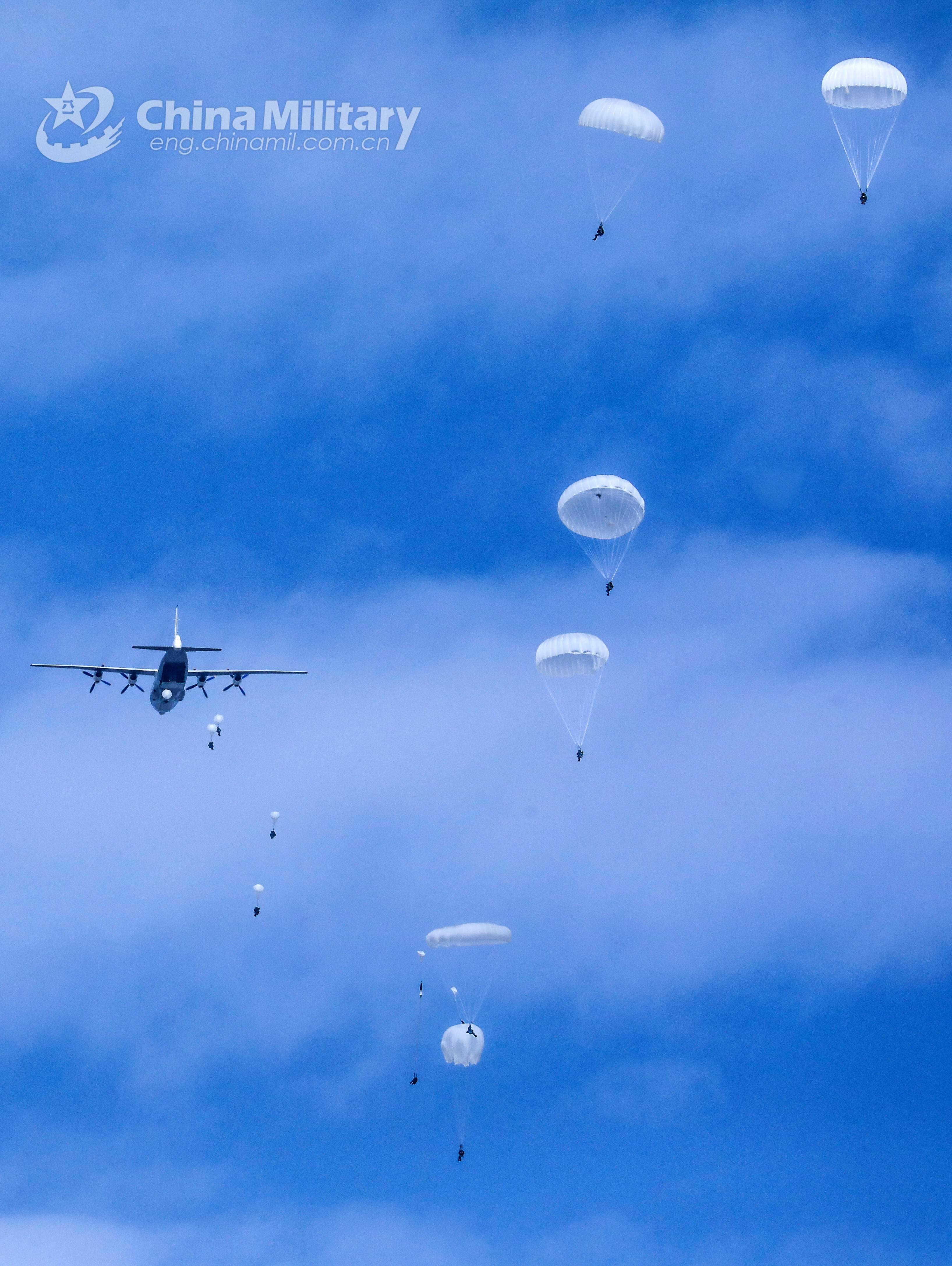 Paratroopers assigned to a brigade under the PLA Air Force’s airborne troops descend to the drop zone after jumping from a transport aircraft during a parachute training exercise in mid-July, 2021. (eng.chinamil.com.cn/Photo by Liu Huan)