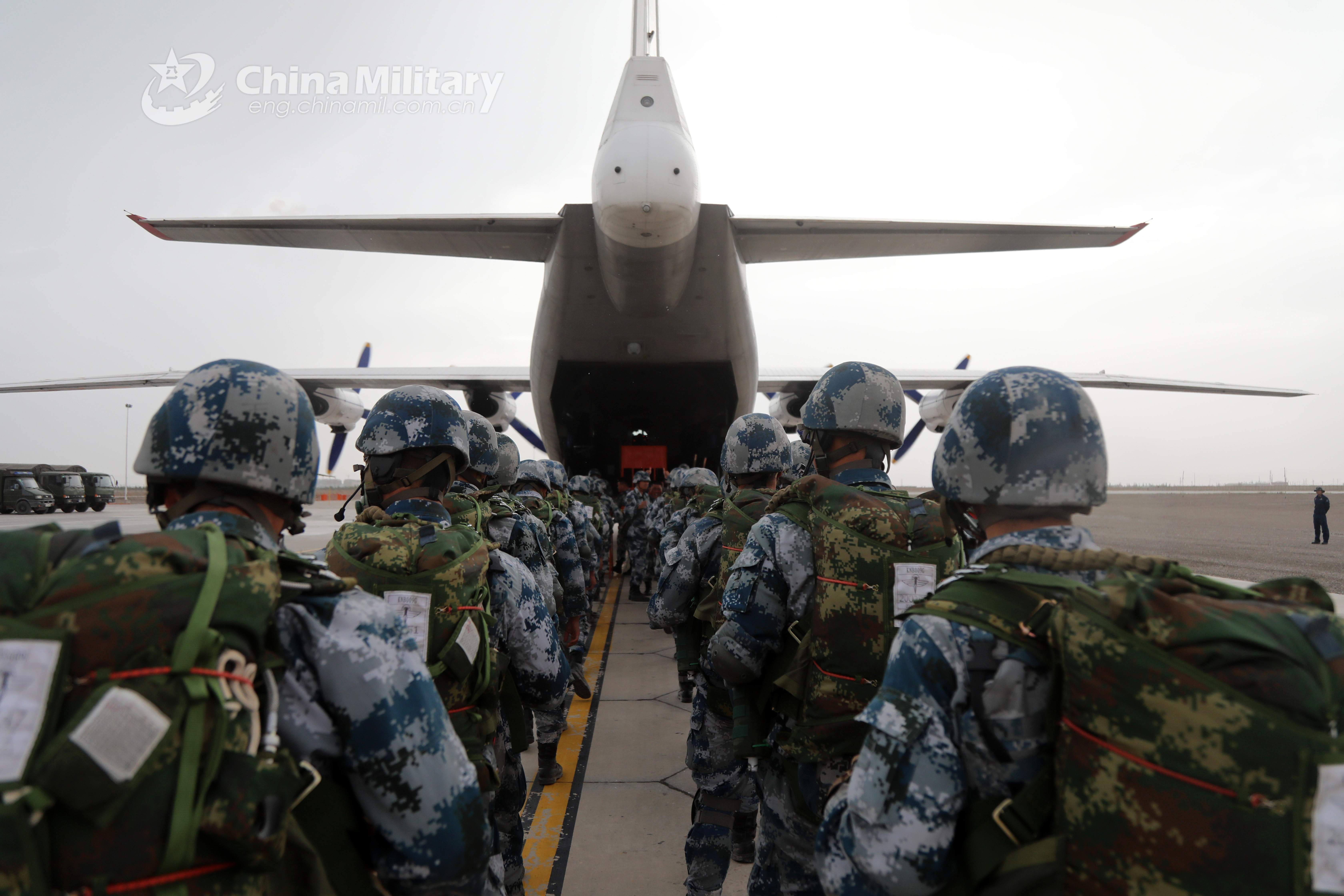 Paratroopers assigned to a brigade under the PLA Air Force’s airborne troops board a transport aircraft in order during a parachute training exercise in mid-July, 2021. (eng.chinamil.com.cn/Photo by Liu Huan)