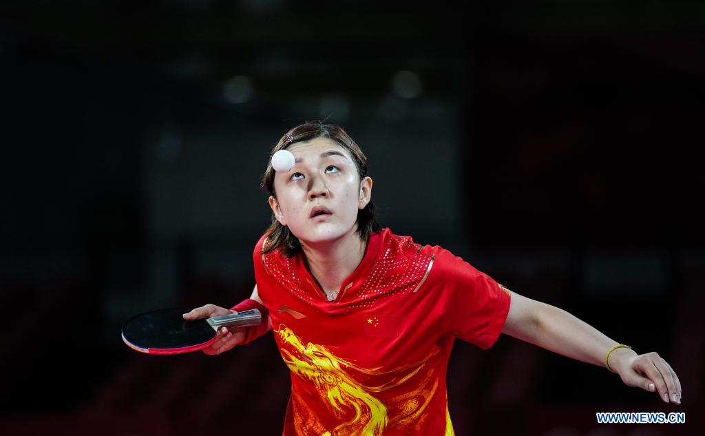 Chen Meng of China serves during the table tennis women's team semifinal between China and Germany at the Tokyo 2020 Olympic Games in Tokyo, Japan, Aug. 4, 2021. (Xinhua/Liu Dawei)