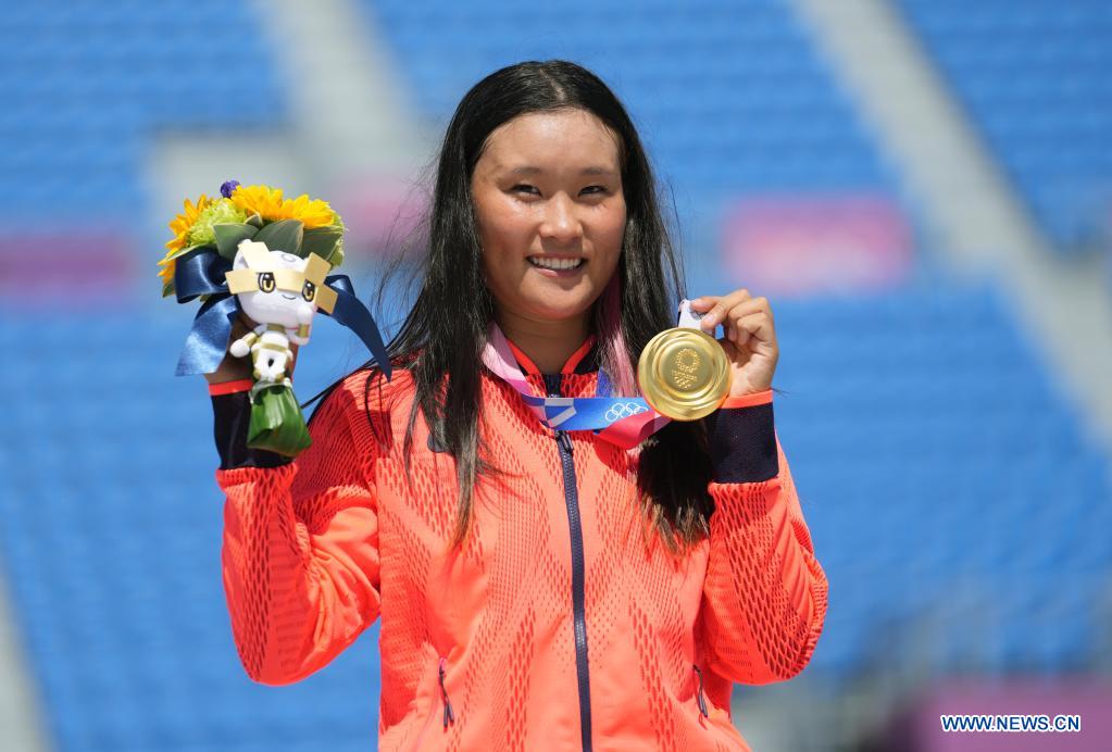 Sakura Yosozumi of Japan poses for photo at the awarding ceremony of women's park final of skateboarding at the Tokyo 2020 Olympic Games in Tokyo, Japan, Aug. 4, 2021. (Xinhua/Li Ga)