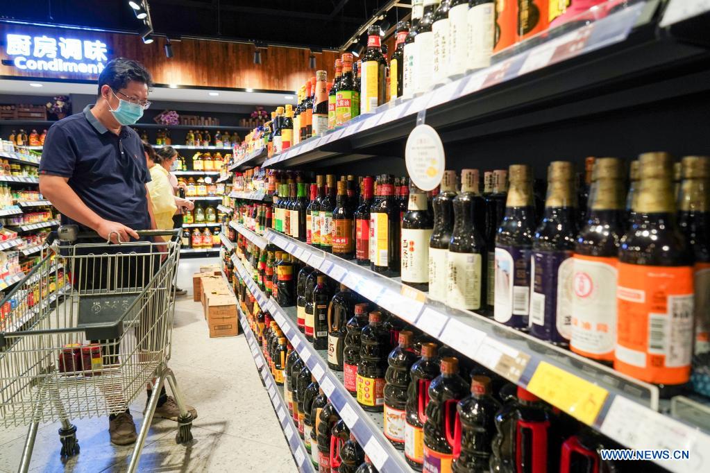A citizen selects flavor products at a supermarket in Yangzhou City, east China's Jiangsu Province, Aug. 4, 2021. During the prevention and control of the resurgence of COVID-19, Yangzhou has taken many measures to ensure the stability of daily necessaries supply. (Xinhua/Li Bo)