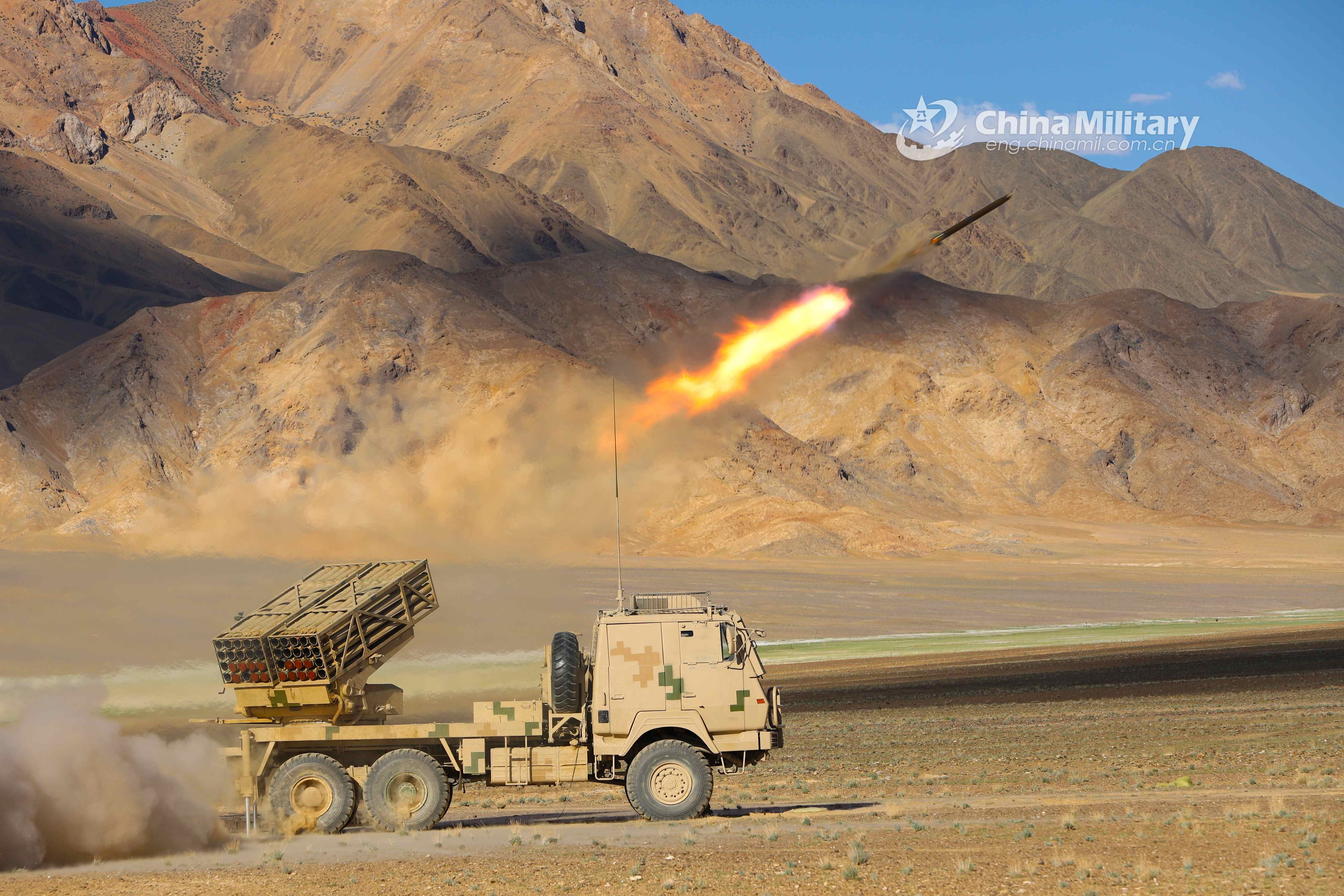 A truck-mounted long-range multiple launch rocket system (LRMLRS) attached to an artillery detachment with a regiment under the PLA Army fires a rocket against the mock target during a live-fire test in July of 2021. (eng.chinamil.com.cn/Photo by Xiang Xudong)