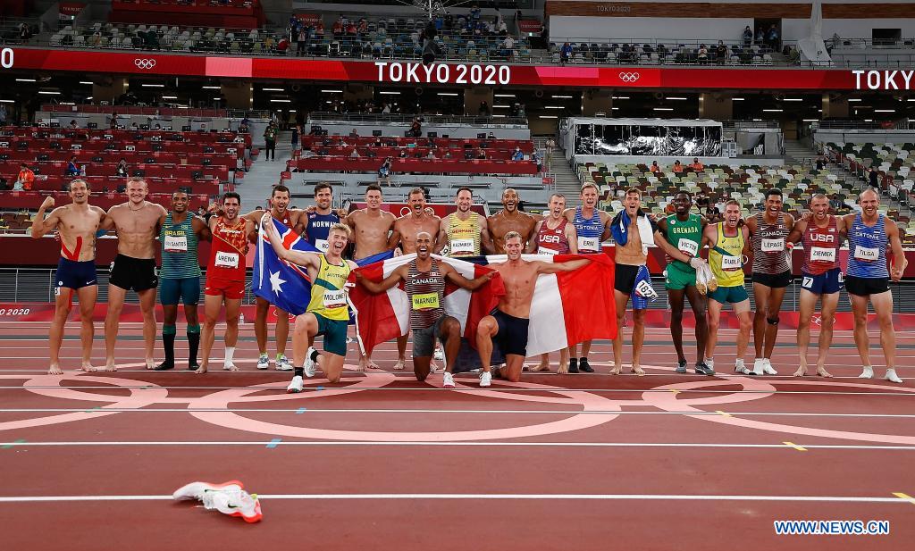 Athletes pose for photos after the Men's Decathlon 1500m at the Tokyo 2020 Olympic Games in Tokyo, Japan, Aug. 5, 2021. (Xinhua/Wang Lili)