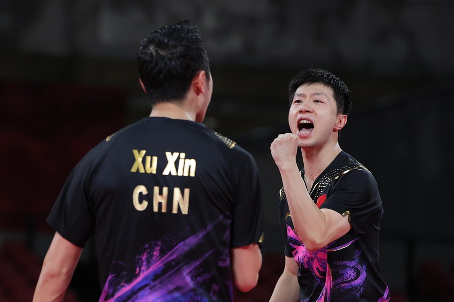 Ma Long (R)/Xu Xin of China compete during the table tennis men's team gold medal match against Germany at the Tokyo 2020 Olympic Games in Tokyo, Japan, Aug. 6, 2021. (Xinhua/Wang Dongzhen)