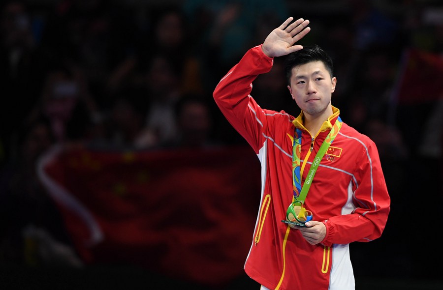 China's Ma Long waves to audience at the awarding ceremony of the men's singles table tennis final at the 2016 Rio Olympic Games in Rio de Janeiro, Brazil, on Aug. 11, 2016. (Xinhua/Lin Yiguang)