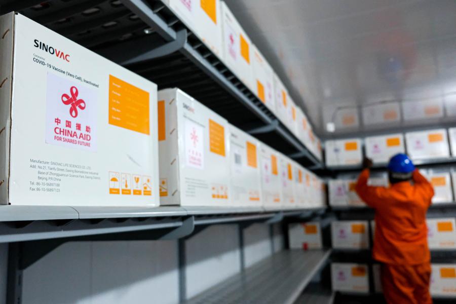 A worker arranges the Sinovac COVID-19 vaccine at National Medical Stores in Entebbe, Uganda, July 31, 2021. (Photo by Hajarah Nalwadda/Xinhua)