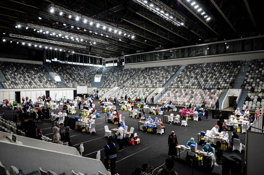 Health workers receive doses of China's Sinovac COVID-19 vaccine during mass vaccination program for health workers as a main priority group in Jakarta, Indonesia, Feb. 4, 2021. (Photo by Agung Kuncahya B./Xinhua)