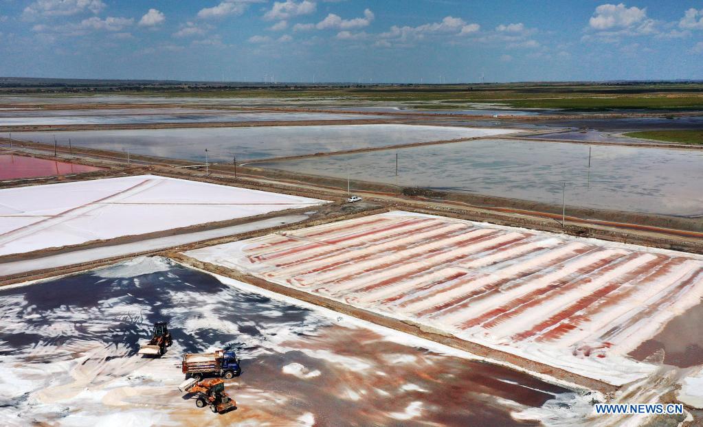 In this aerial photo, salt factory employees load salt onto a truck at a salt lake in Dingbian County, northwest China's Shaanxi Province, Aug. 7, 2021. (Xinhua/Tao Ming)
