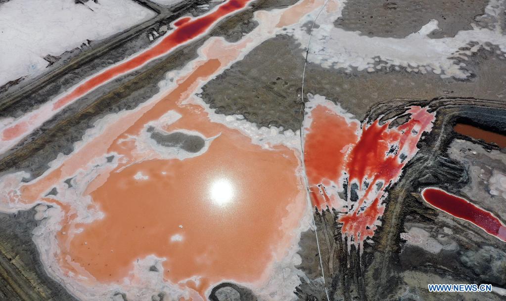 Aerial photo taken on Aug. 7, 2021 shows a salt lake in Dingbian County, northwest China's Shaanxi Province. (Xinhua/Tao Ming)