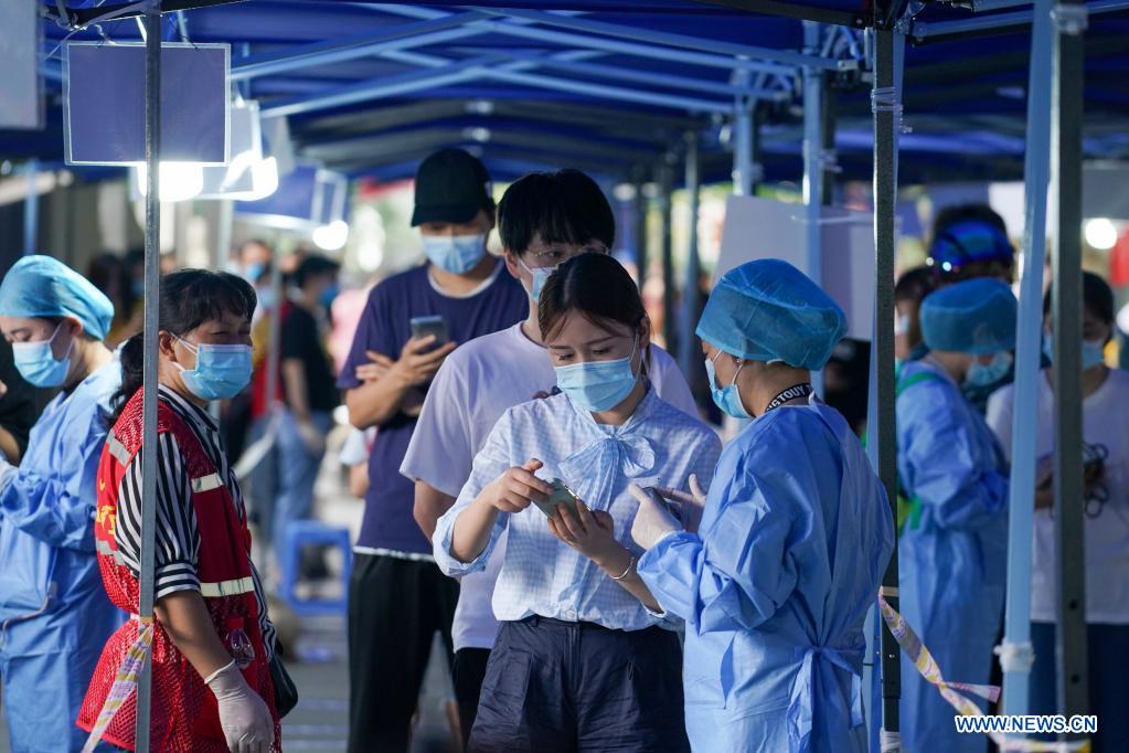A medical worker registers information of residents at a nucleic acid testing spot in Nanjing, capital of East China's Jiangsu province, July 29, 2021. (Photo/Xinhua)