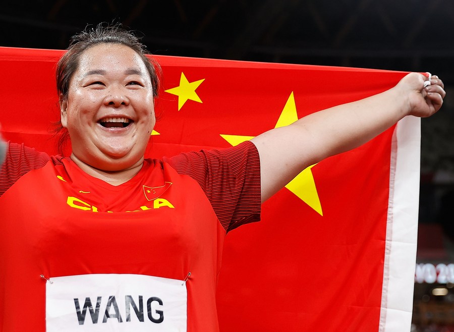 Wang Zheng of China celebrates after the Women's Hammer Throw Final at the Tokyo 2020 Olympic Games in Tokyo, Japan, Aug. 3, 2021. (Xinhua/Wang Lili)