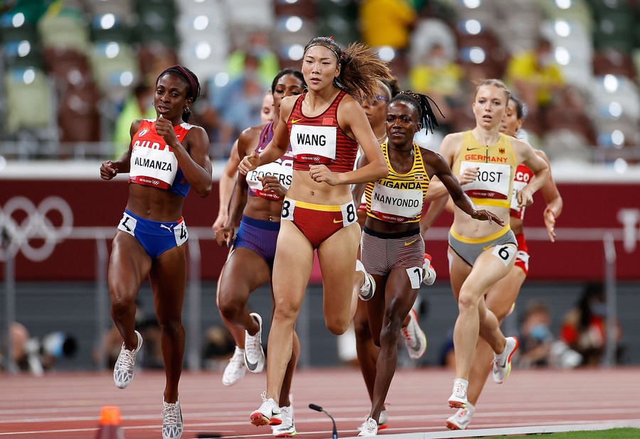 Wang Chunyu (front) of China competes during the women's 800m semi-final at the Tokyo 2020 Olympic Games in Tokyo, Japan, July 31, 2021. (Xinhua/Wang Lili)
