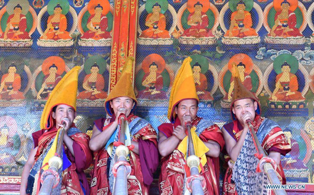 Monks welcome the 11th Panchen Lama, Bainqen Erdini Qoigyijabu, also a member of the Standing Committee of the National Committee of the Chinese People's Political Consultative Conference, vice president of the Buddhist Association of China and president of the association's Tibet branch, upon his arrival at the Tashilhunpo Monastery in Xigaze, southwest China's Tibet Autonomous Region, Aug. 8, 2021. The 11th Panchen Lama visited the Tashilhunpo Monastery on Sunday and Monday. (Xinhua/Chogo)