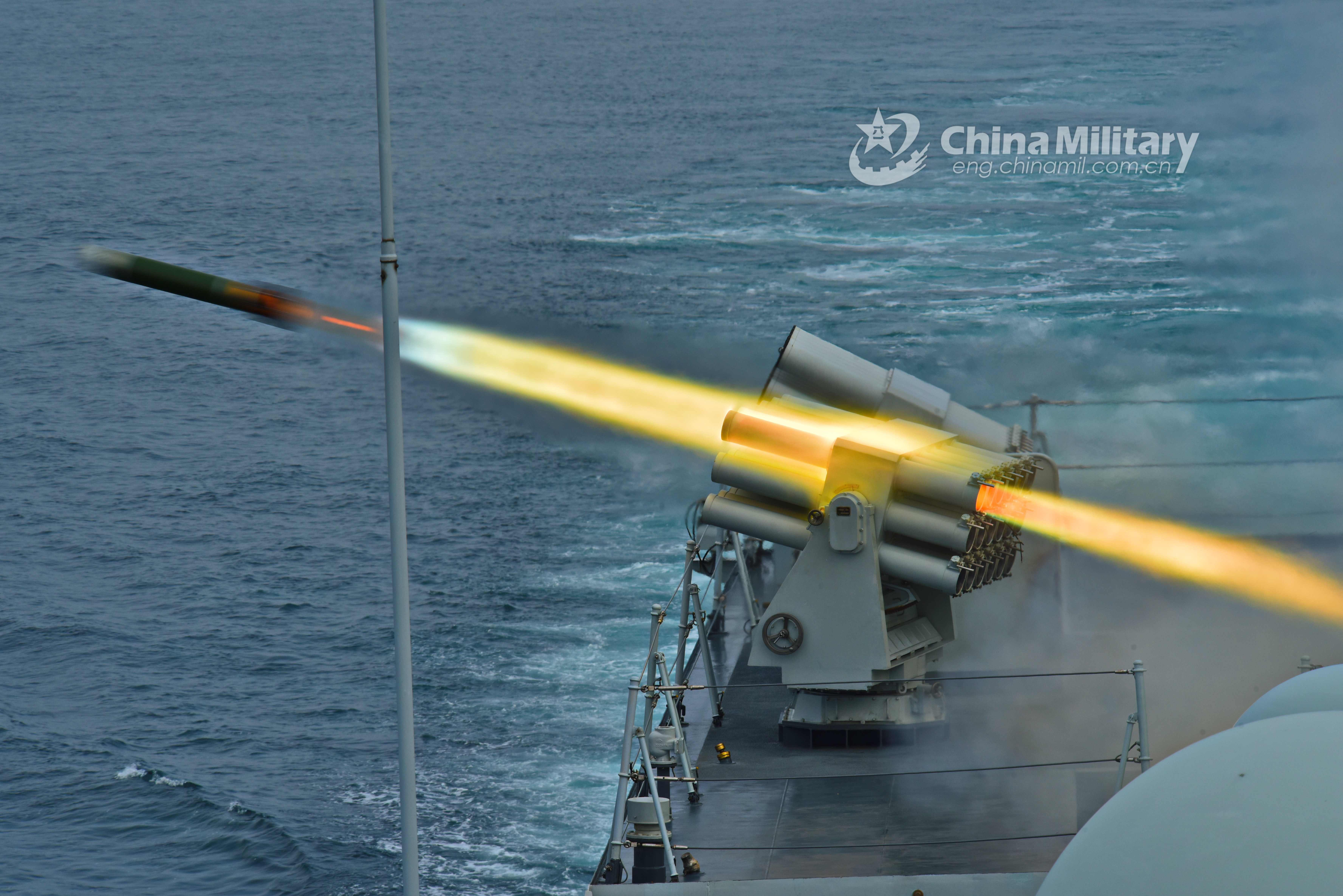 The guided-missile frigate Yantai (Hull 538) attached to a destroyer flotilla with the navy under the PLA Northern Theater Command fires jamming bombs to mask the movement during a maritime live-fire training exercise in waters of the Yellow Sea in late July. The training exercise focused on subjects including striking maritime and aerial targets, joint search and rescue, anti-submarine operation, warship and airplane cooperative training. (eng.chinamil.com.cn/Photo by Du Jiangfan)
