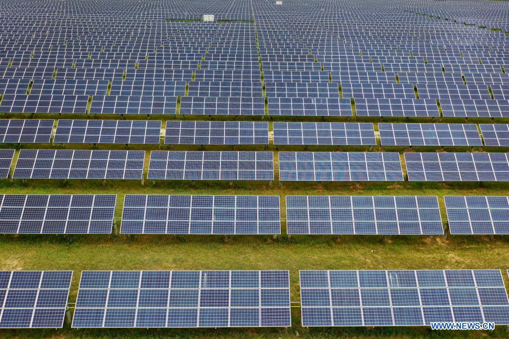 Aerial photo taken on Aug. 3, 2021 shows a photovoltaic power station in Tujing Village, Yunzhou District of Datong City, north China's Shanxi Province. The photovoltaic power station, built upon 1,851 mu (123.4 hectares) of saline-alkaline land, generates over 80 million KWH of power per year. (Xinhua/Cao Yang)