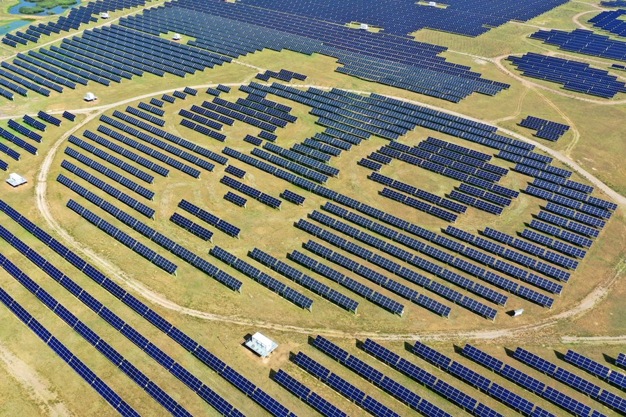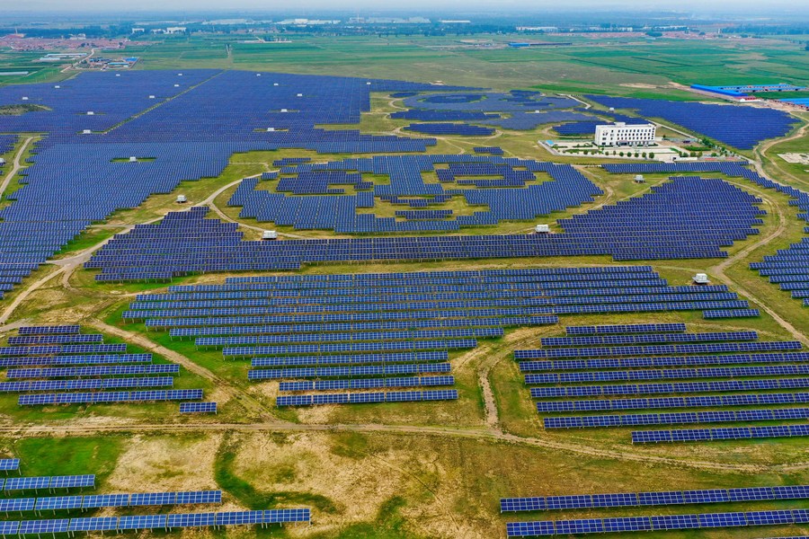 Workers check solar panels at a photovoltaic power station in Datong City, north China's Shanxi Province, Aug. 3, 2021. (Xinhua/Cao Yang)