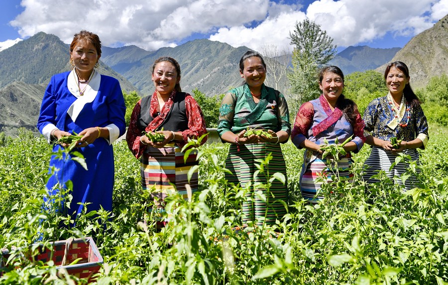 Farmers show newly-harvested peppers in Guncun Village in Nyingchi, southwest China's Tibet Autonomous Region, July 27, 2020. (Xinhua/Zhang Rufeng)