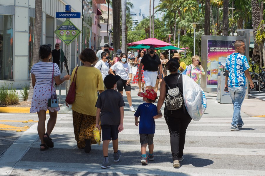 People walk on Lincoln Road in Miami-Dade County, Florida, the United States, Aug. 6, 2021. (Photo by Monica McGivern/Xinhua)