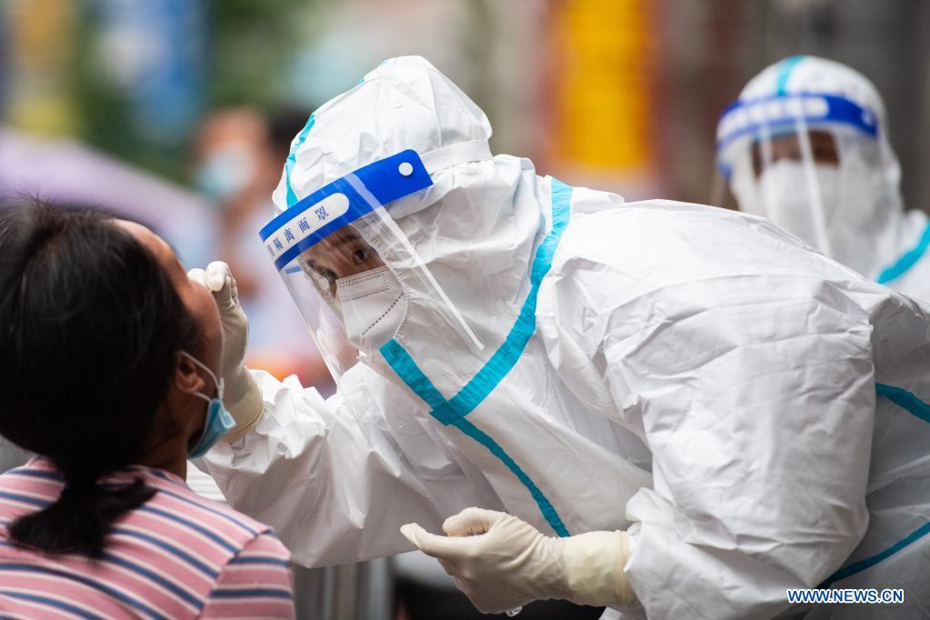 A medical worker takes a swab sample from a woman for COVID-19 nucleic acid testing in Zhangjiajie, central China's Hunan Province, Aug. 10, 2021. (Xinhua/Chen Sihan)