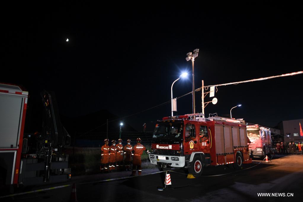 Rescue team members gather at the site of a coal mine accident in Haibei Tibetan Autonomous Prefecture, northwest China's Qinghai Province, Aug. 14, 2021. China's Ministry of Emergency Management has sent a work team to the northwest province of Qinghai to guide rescue efforts after a coal mine was flooded by mud on Saturday. Of the 21 miners working in the mine when the accident occurred, two were lifted to the ground, including one who was confirmed dead, while the rest remained trapped, according to the ministry. Rescue operations are underway as more rescuers rushed to the site. (Xinhua/Wu Gang)