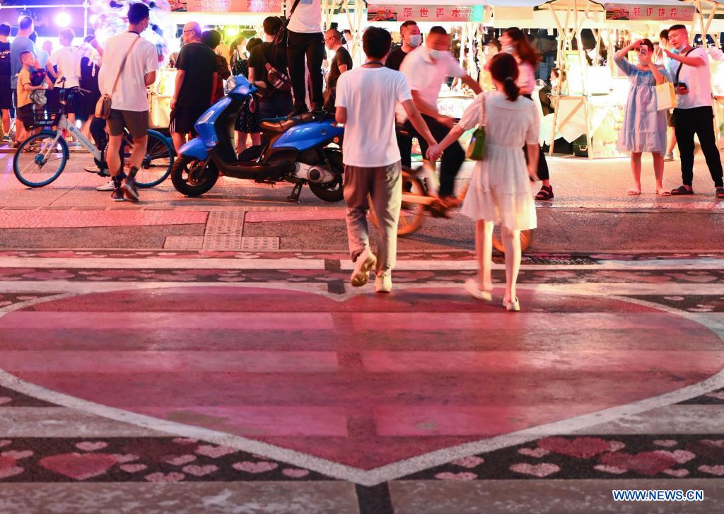 A couple walk on a heart-shaped zebra crossing in Chengdu, capital of southwest China's Sichuan Province, Aug. 14, 2021. The Qixi festival, or Chinese Valentine's Day, falls on Aug. 14 this year. (Xinhua/Xu Bingjie)