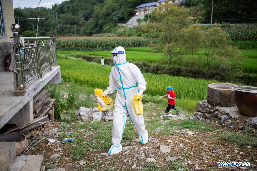 Luo Jinwu walks to offer door-to-door nucleic acid sampling services in Yangping Village of Yongding District in Zhangjiajie City, central China's Hunan Province, Aug. 12, 2021. Luo Jinwu and his wife Xiang Ka are medical workers from Zhangjiajie Hospital of Traditional Chinese Medicine. Since the recent resurgence of COVID-19 in Zhangjiajie from July 29, Luo has been conducting nucleic acid tests especially in the countryside, while Xiang has stationed in the hospital to attend to patients. Being apart for about half a month, the couple kept in contact via video link. "Both of us understand the heavy workload we bear at the front line of epidemic prevention and control," Xiang said, hoping the coronavirus resurgence will soon be deterred and they can be reunited. (Xinhua/Chen Sihan)